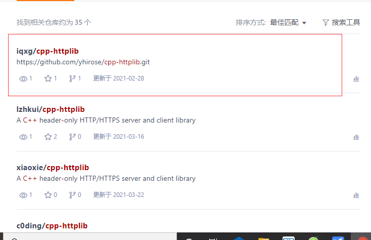 在Linux中使用cpp-httplib库时,只需要把它下载下来,然后在写代码时包含该头文件就可以了。我们在可以进入gitee直接搜索cpp-httplib,点击第一个