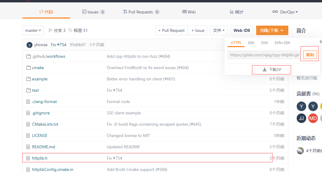 clone或者下载zip都可以(我们主要用到的时httplib.h),下载zip的话需要把httplib.h解压出来。 下面我们就用这个库来创建一个服务器: (1).把httpib.h复制到项目文件下